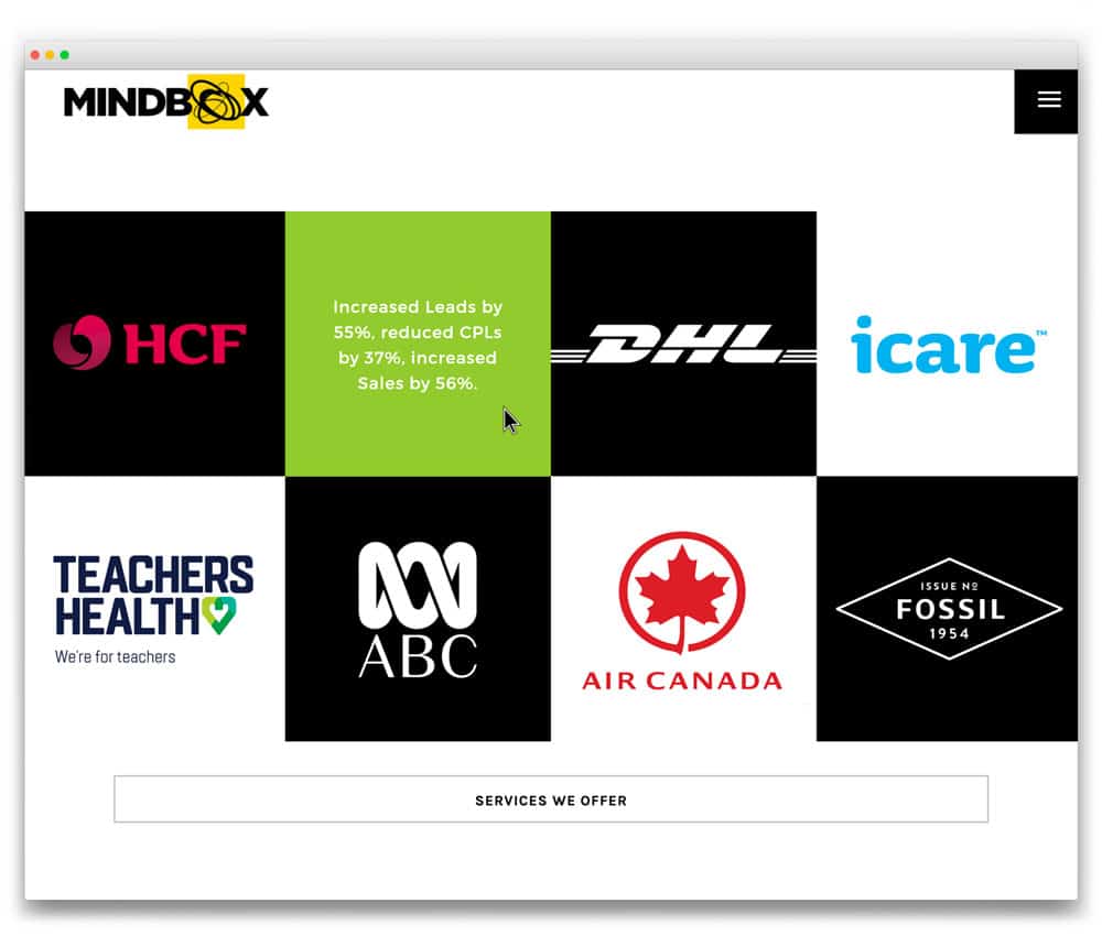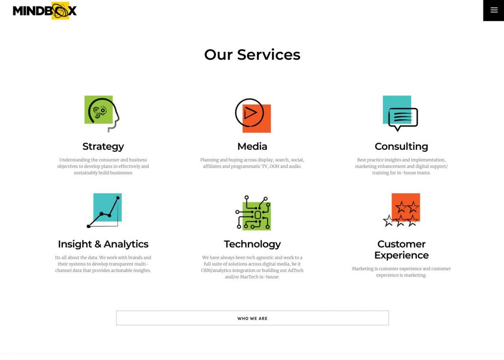SOLUTION: The original site was created by us as a parallax website with all content on the home page. This time we simplified the home page and provided an easy path to get to additional information about the team and services. We kept elements from the previous website like the Work section and the opening video, but we developed it further by introducing the yellow square, a feature of the Mindbox brand. We also introduced more brand colours and created bespoke service icons to match the brand design.