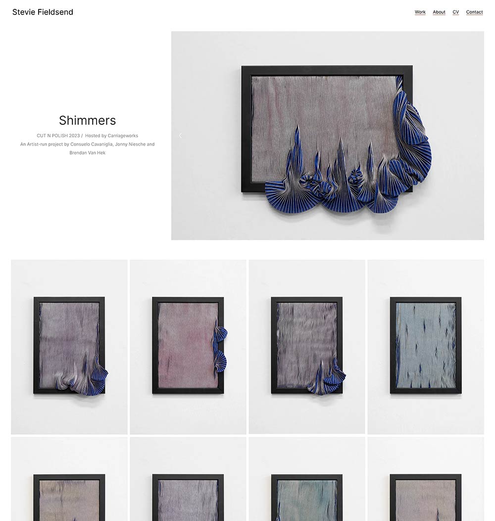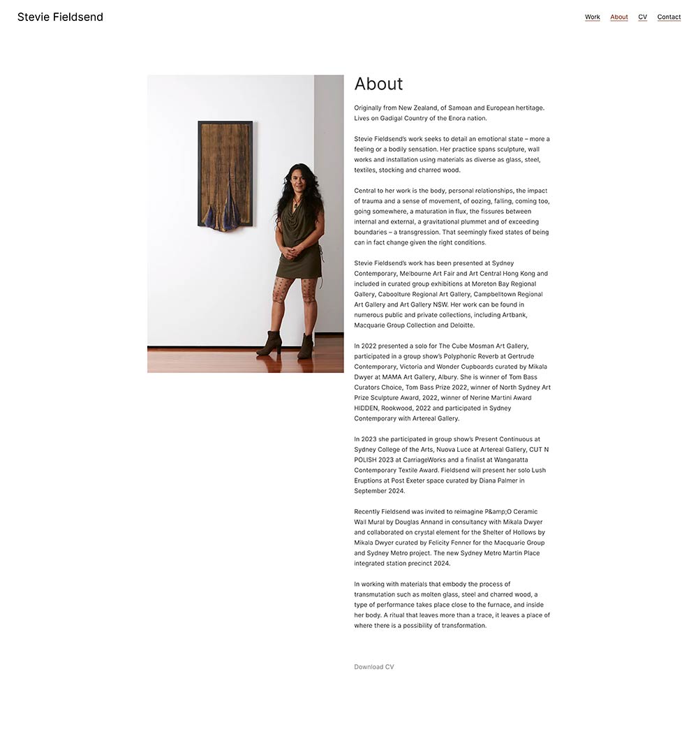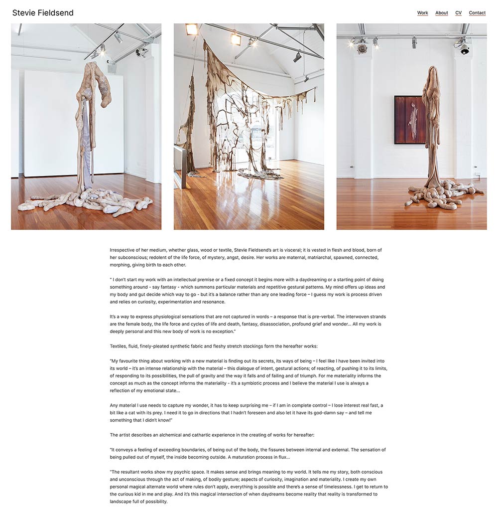 For this website, we recommended a premium WordPress portfolio theme to professionally document the work and career of Sydney-based artist Stevie Fieldsend. The theme’s flexible and responsive layout modules were customised into a clean, gallery-like style, and images were carefully curated to exhibit her sculptural and installation works online.